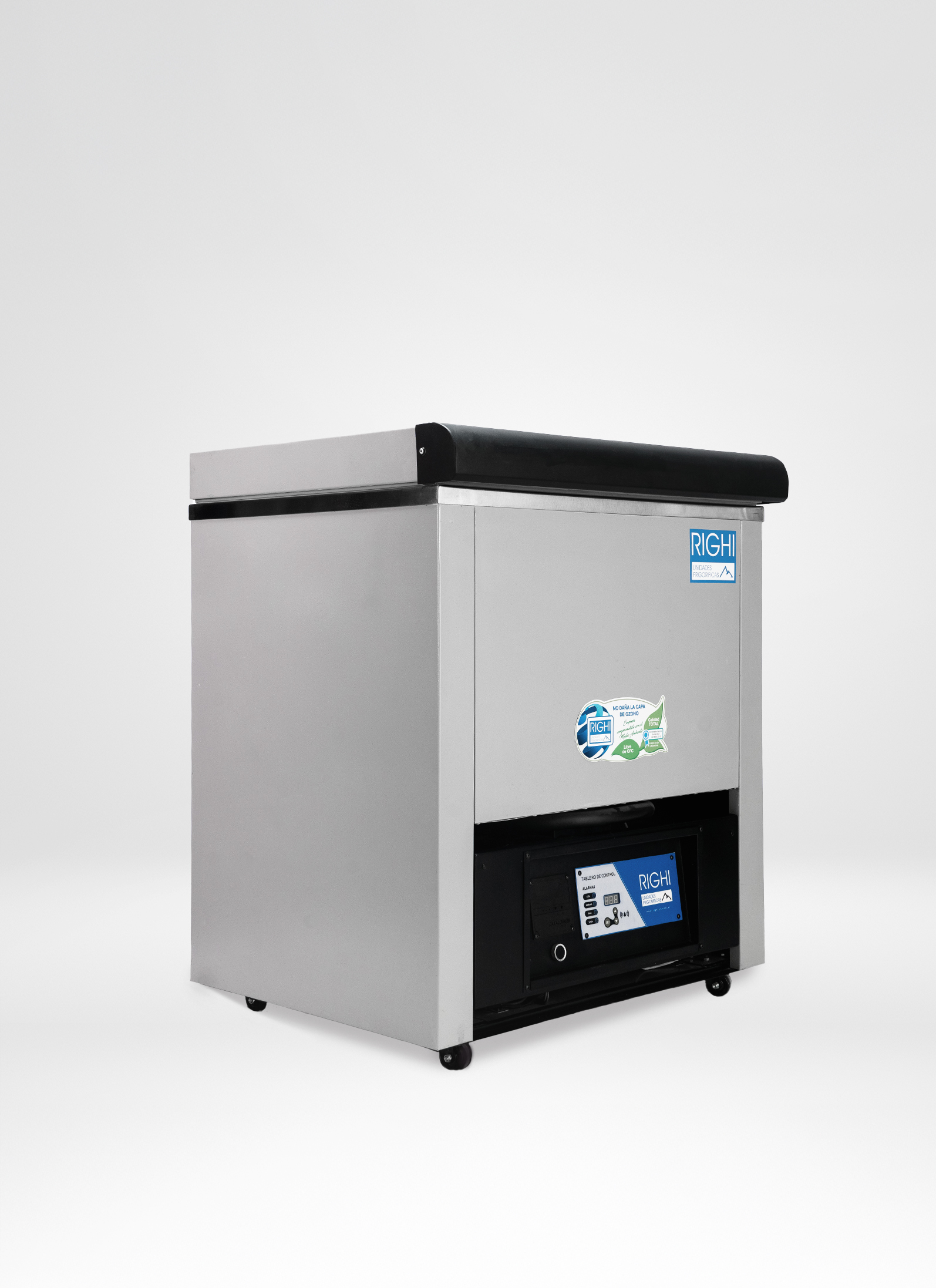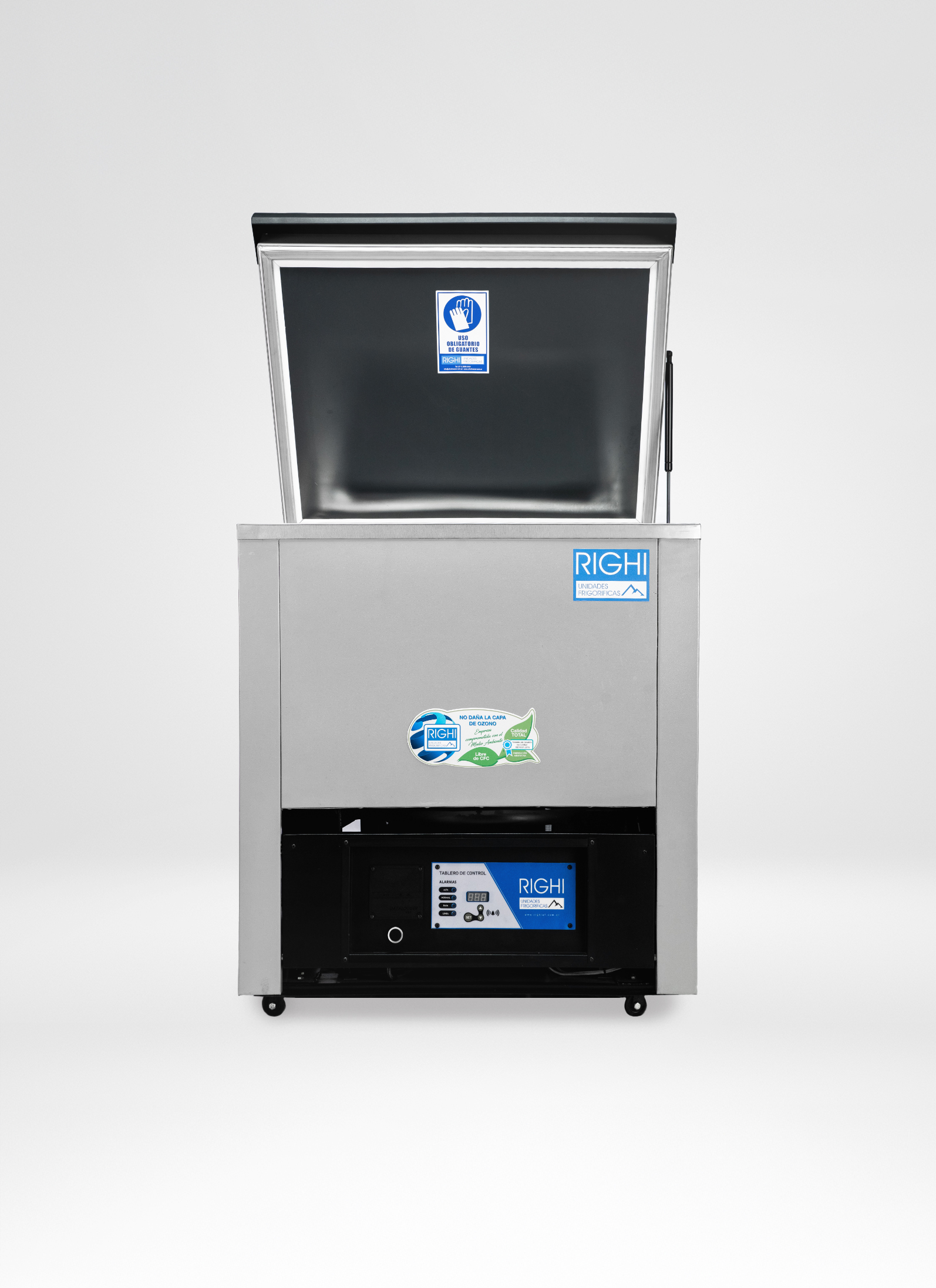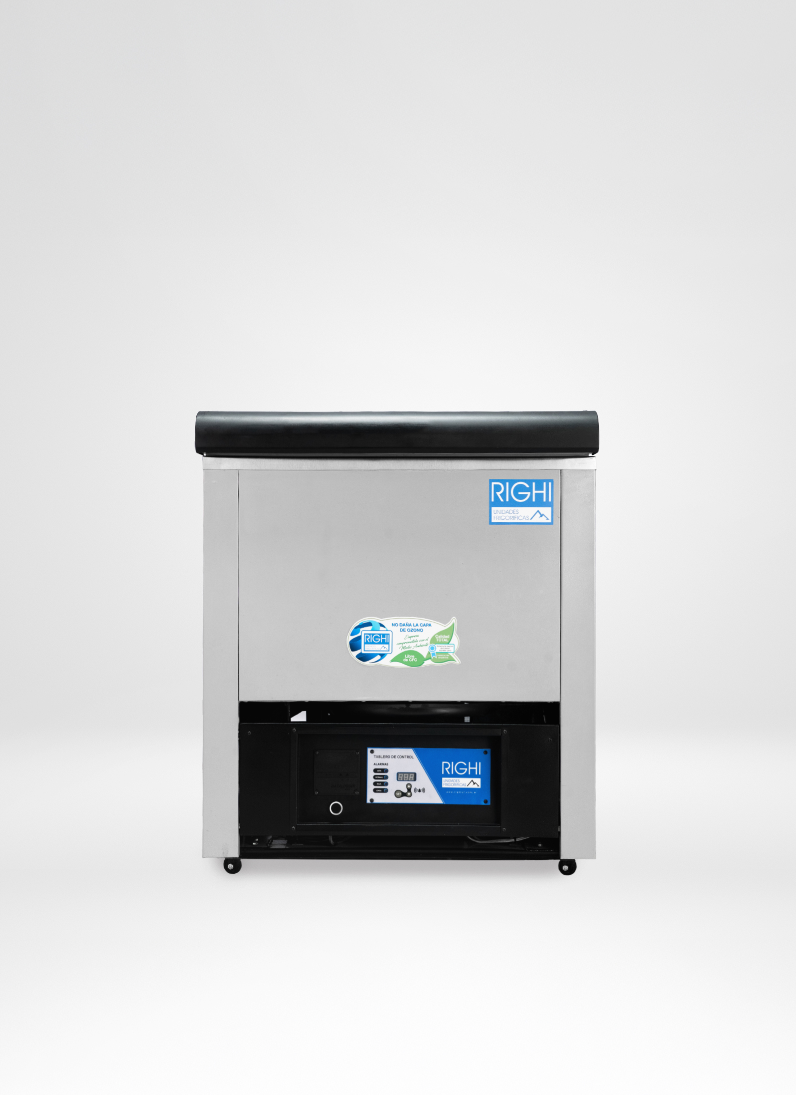 Alarmas visuales de led y sonoras alimentadas con batería por falta de tensión y/o alta o baja temperatura con silenciador. Instrumentación de protección frigorífica. Motocompresor hermético (con sistema de blindado)