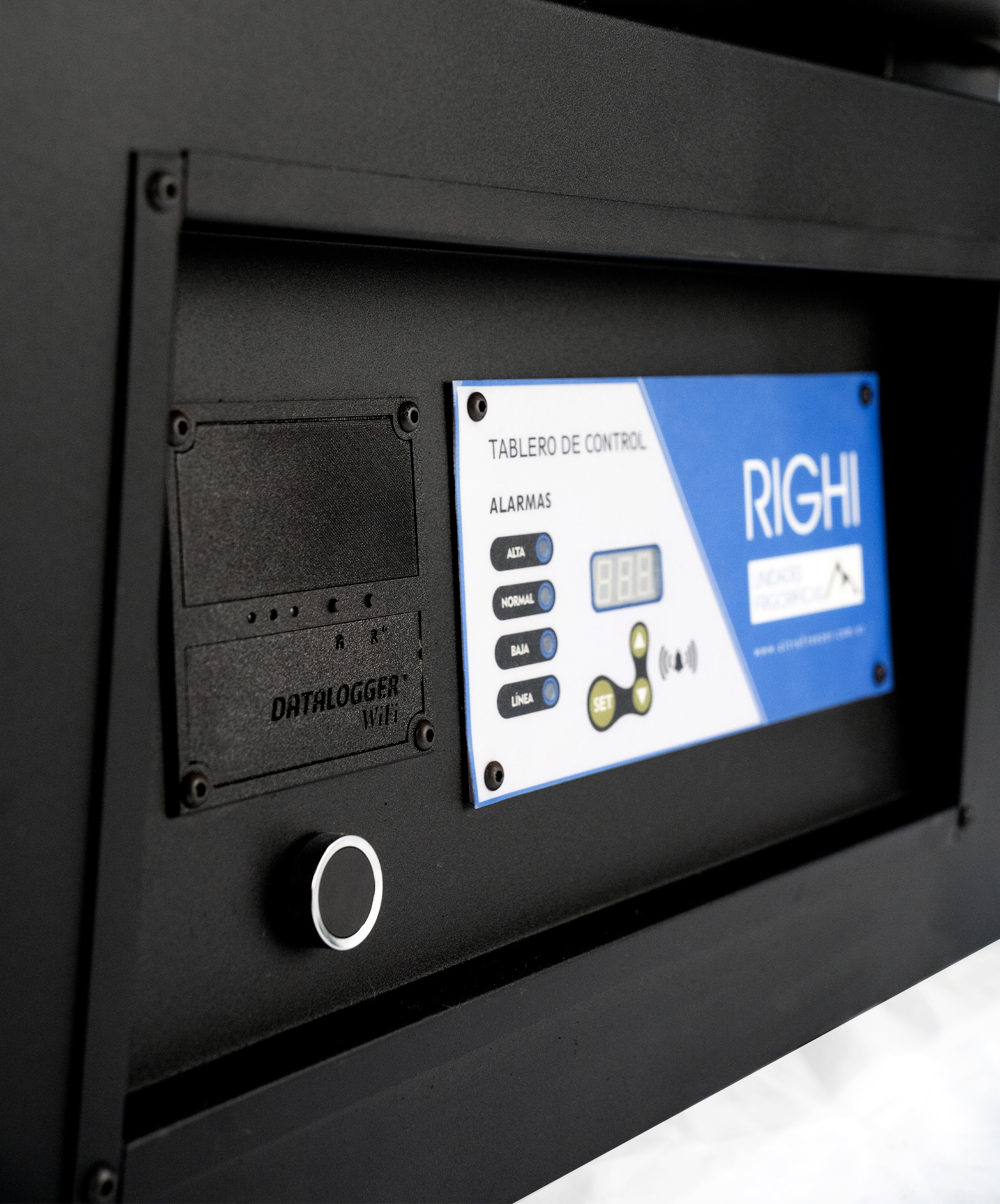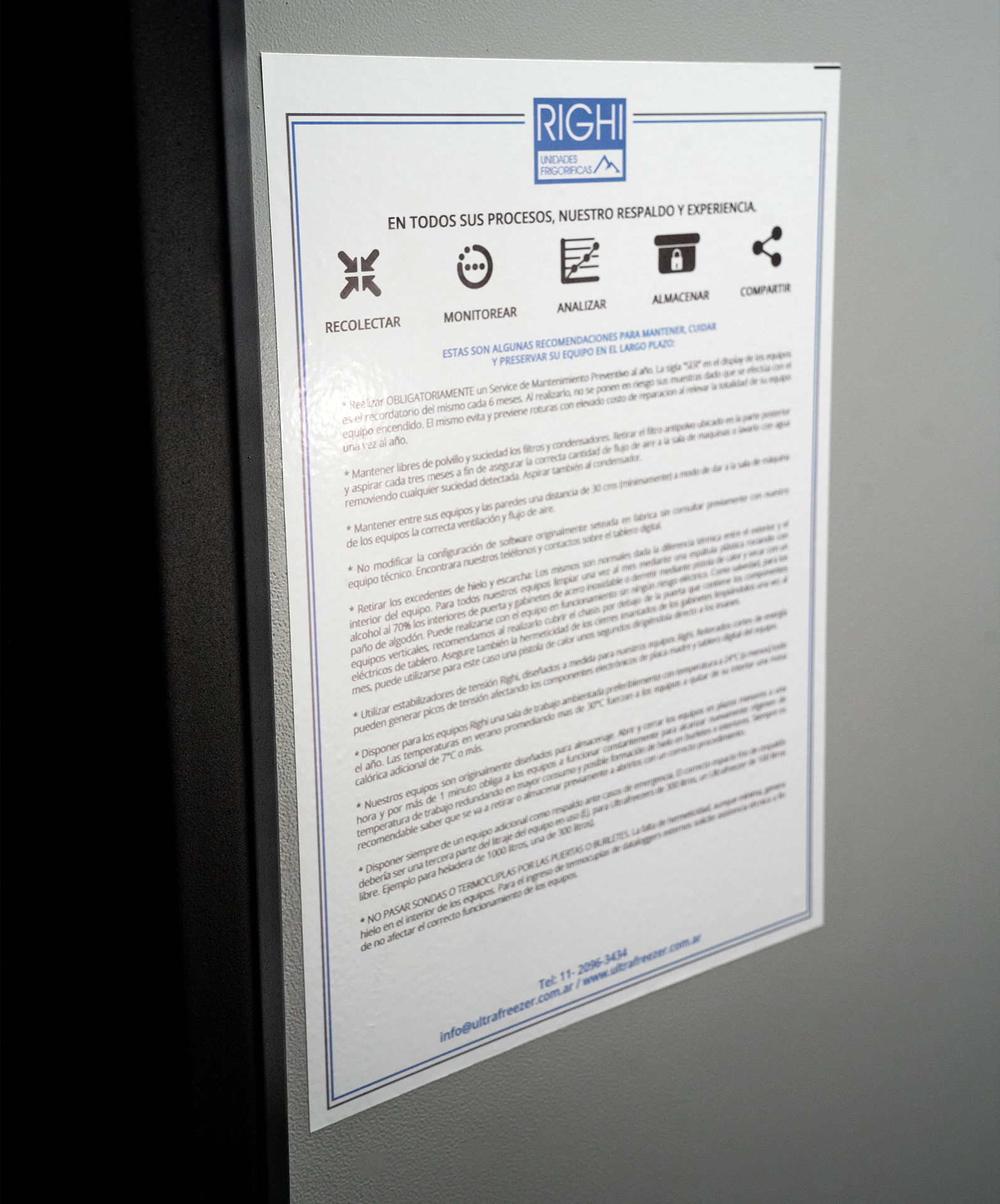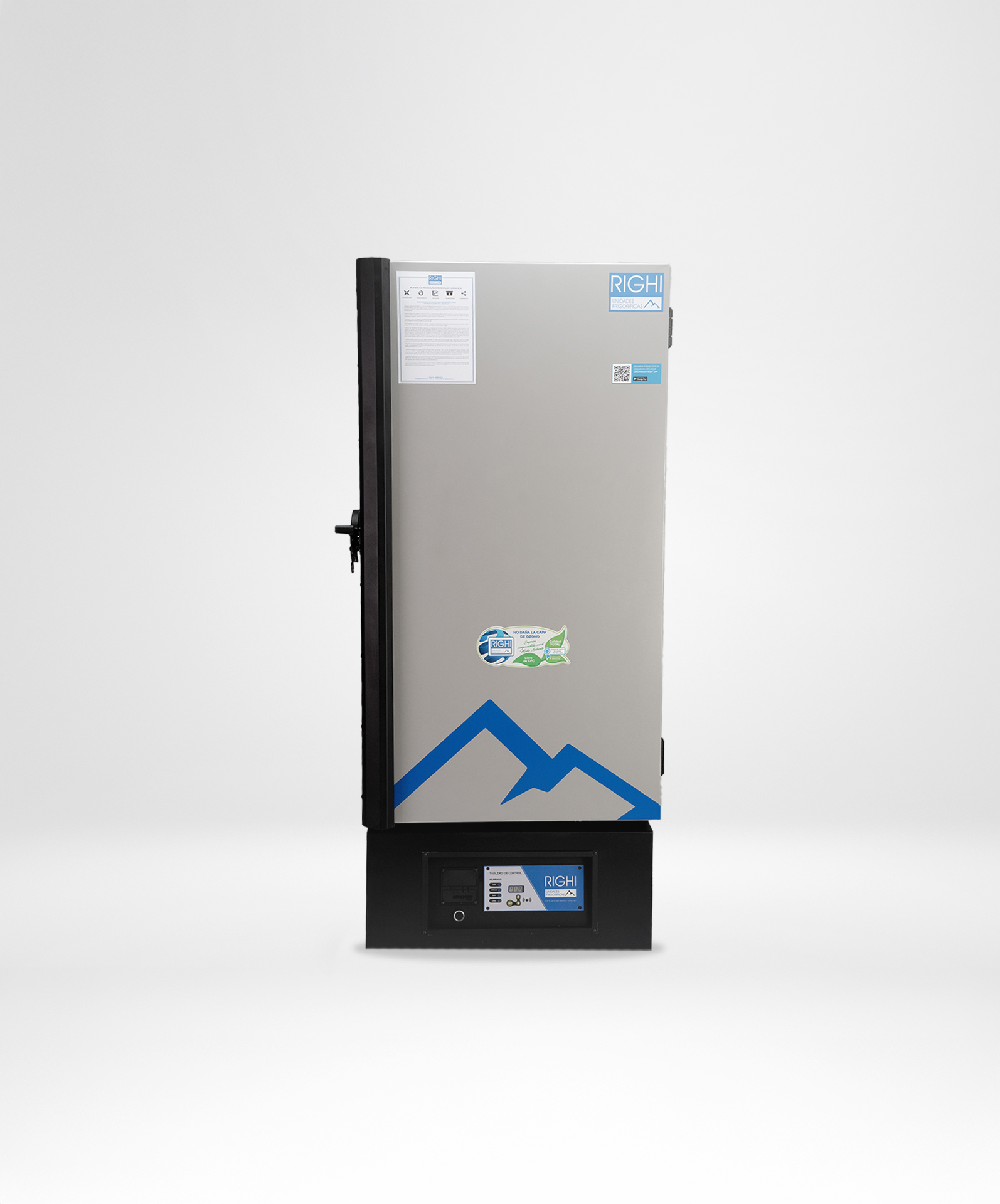 Alarmas visuales de led y sonoras alimentadas con batería por falta de tensión y/o alta o baja temperatura con silenciador. Instrumentación de protección frigorífica. Motocompresor hermético (con sistema de blindado)